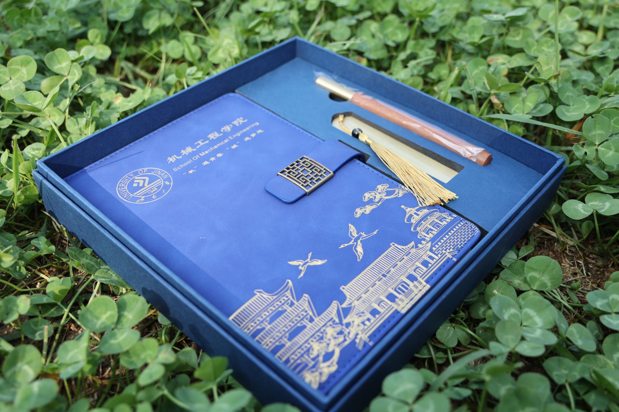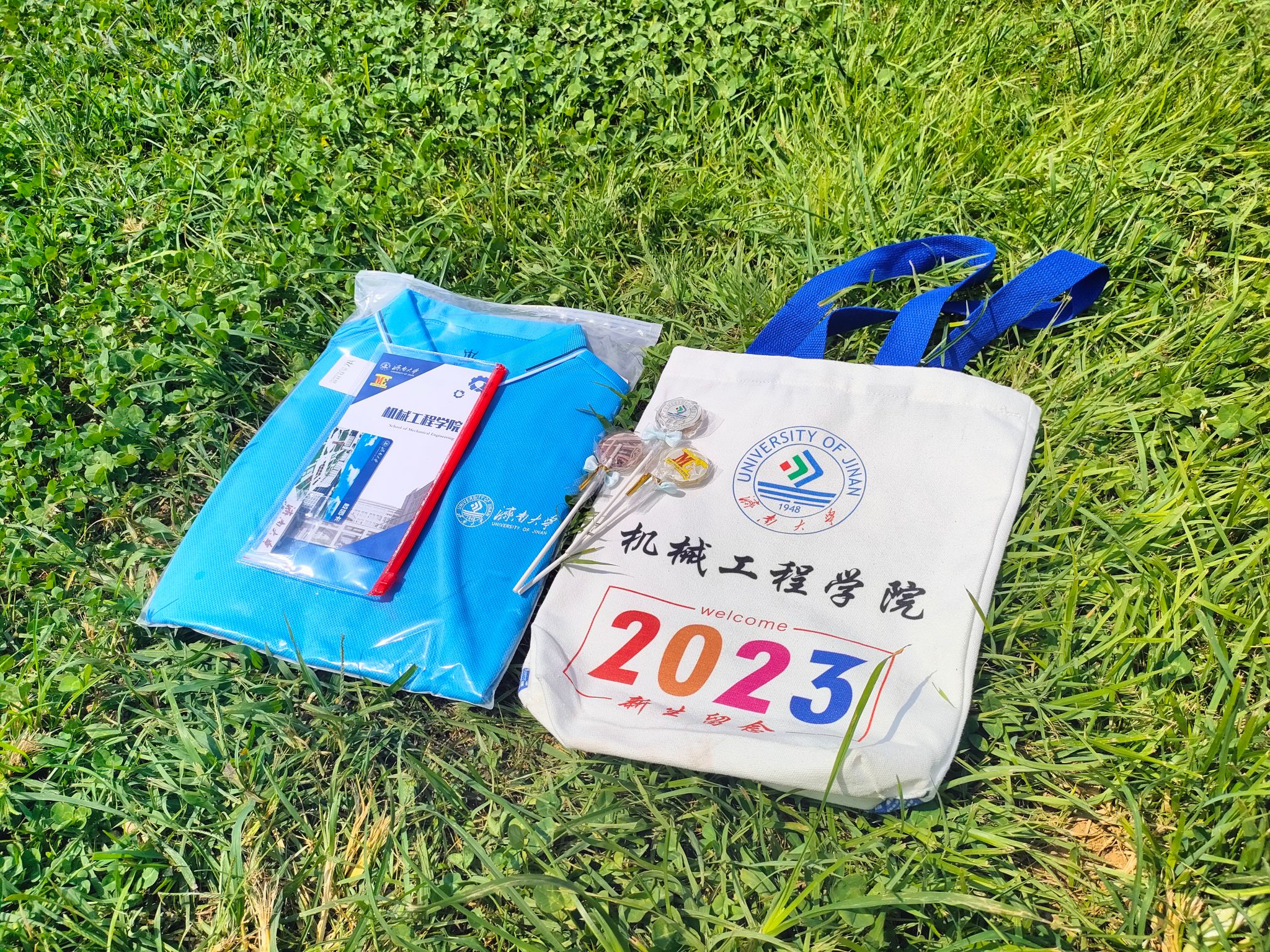 在迎新报到点,学院为每一位新生准备了迎新大礼包,其中包括定制的帆布袋、院服、学院宣传页、新生文件袋,同时学院还准备了“抽盲盒”的趣味活动,有学院定制文创礼盒、机械专业制图工具、英语四级单词卷纸、学院特色钥匙扣、校园风景棒棒糖等,通过盲盒的形式收获来自济南大学的第一份礼物。